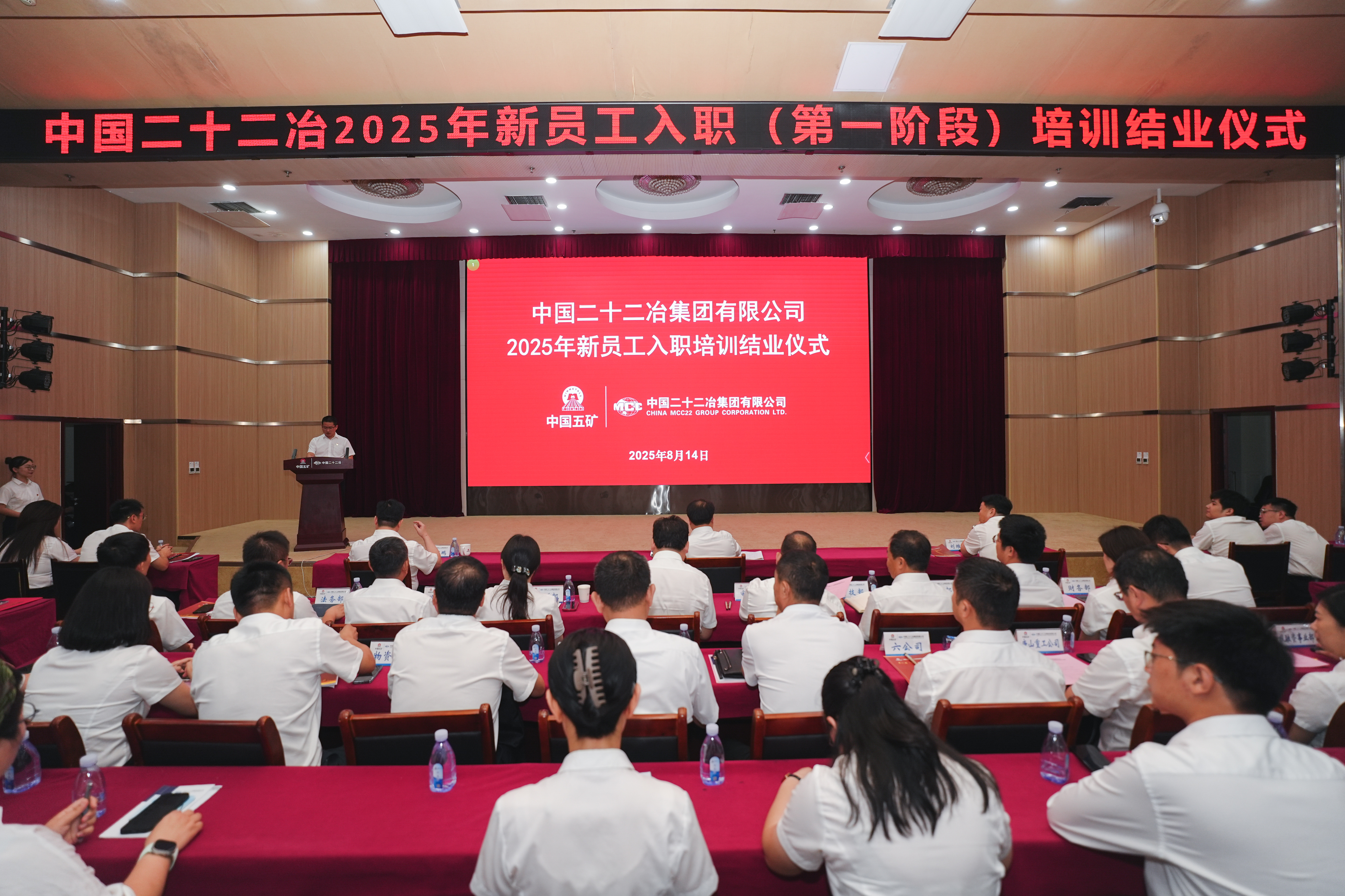 8月14日,中國二十二冶召開2025年新員工入職培訓(第一階段)結(jié)業(yè)儀式。中國二十二冶黨委書記、董事長袁斯浪,黨委副書記、職工董事張育鵬,工會主席、專項工作督導辦公室主任劉維棟出席。黨委組織部(人力資源部)副部長(主持工作)郭穎川主持結(jié)業(yè)儀式。
